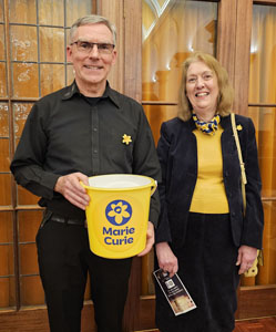 Our chosen charity for our Winter Concert 2024 was Marie Curie whose nurses help with the provision of end-of-life care at home for people in the Borders. We collected £274.46 in donations at the concert and the orchestra has been able to contribute a further £750 from our ticket sales to make a magnificent total donation to Marie Curie of £1,024.46. The photograph shows our Treasurer, Paul, with Caroline Green, a fundraising volunteer with Marie Curie in the Borders, at the concert on Saturday.Further information on the services Marie Curie provides can be found by clicking on the link www.mariecurie.org.uk